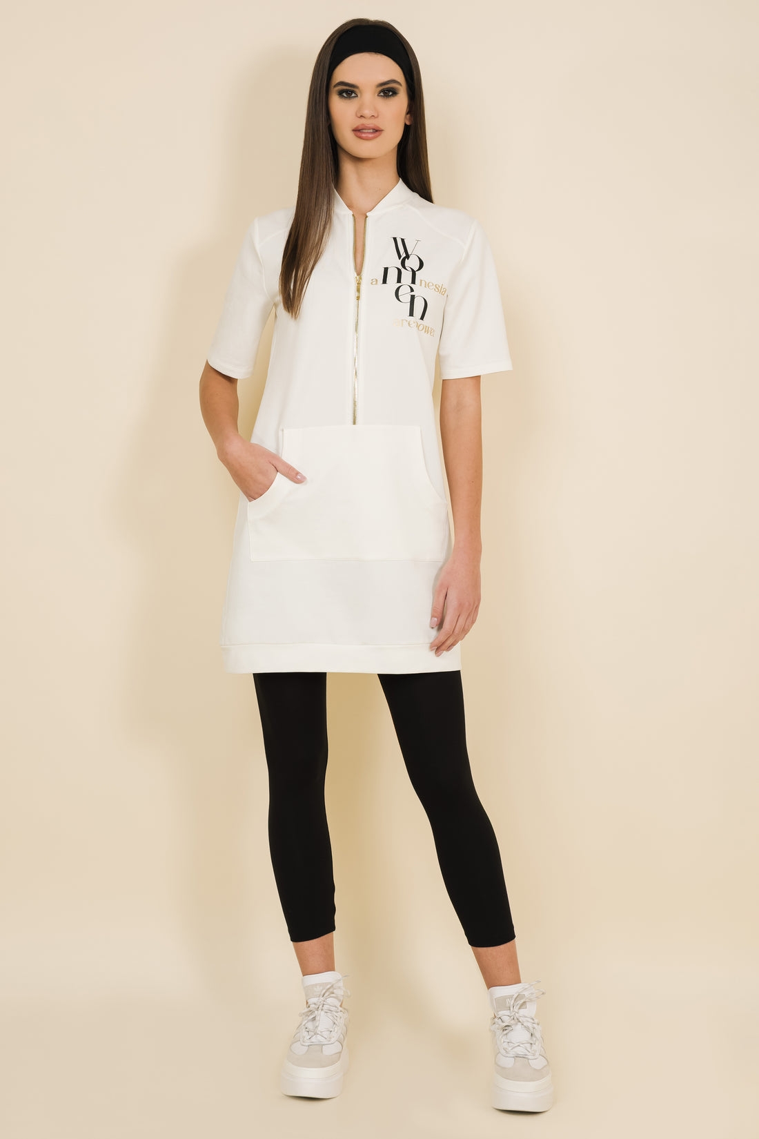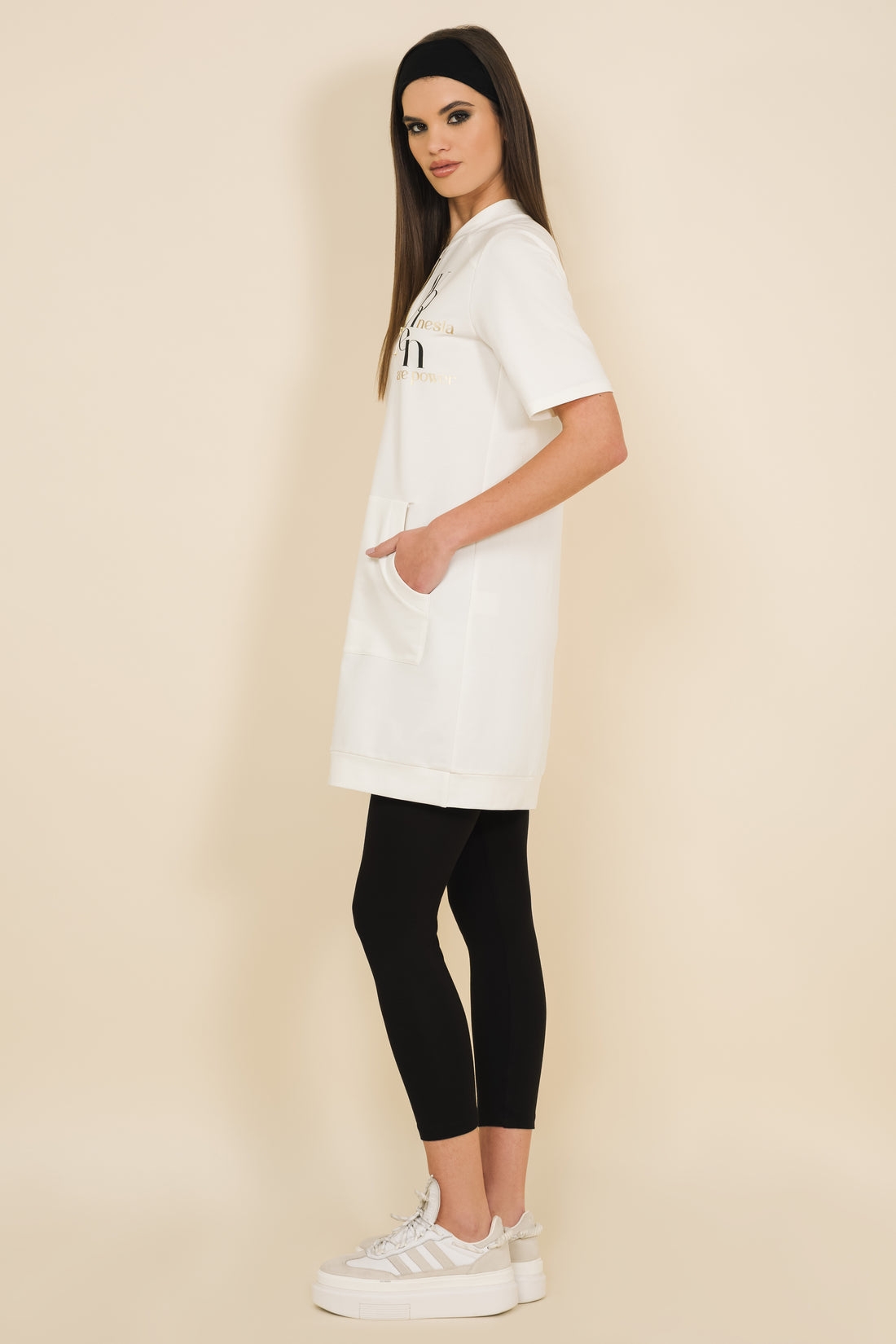 Az AMNESIA Izisz ruha tökéletes választás a sportos stílus kedvelőinek. Finom futter anyaga, cipzáros betétje és a kenguru zseb komfortos viseletet biztosít, míg a logóminta egyedi megjelenést ad hozzá. Ekrü, fekete és rózsaszín színben is elérhető, és jól kombinálható AMNESIA leggins-szel vagy szűk nadrággal egy laza, mégis stílusos szettért.