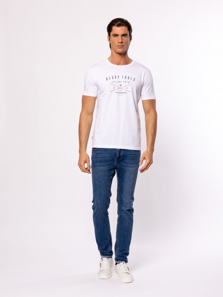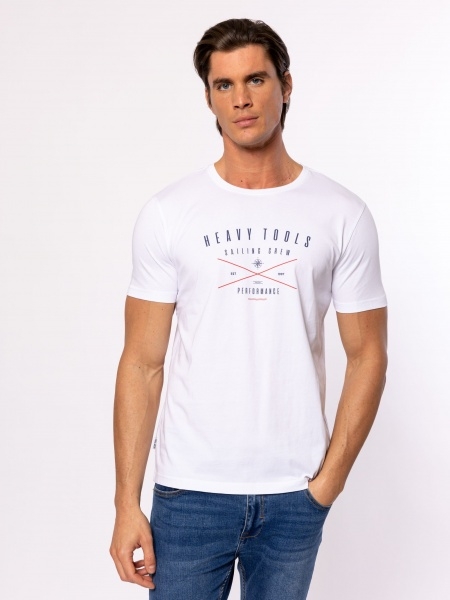 Férfi rövid ujjú póló, egyenes szabással, kerek nyakkal, elején nagy nyomott vitorlás tematikájú dekorációval, oldalában szövött márkajelzéssel. Anyaga: 100% pamut, single jersey