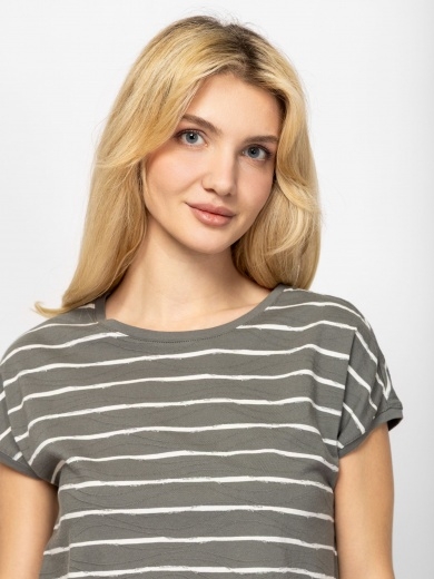 Női rövid ujjú póló, laza szabással, kerek nyakkal és ejtett vállal. Csíkos anyagból készült, zsinórral behúzható oldalvonallal, hátán kis márkajelzéssel. Anyaga: 100% pamut, jacquard. A modell 175 cm magas és S-es méretet visel.