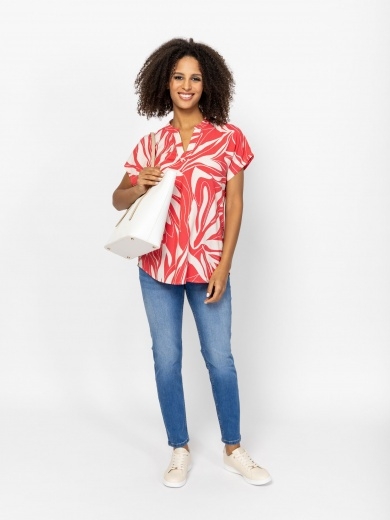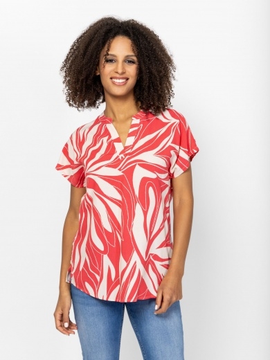 Női rövid ujjú blúz, egyenes szabással,V-nyakkal, mintás anyagból. Anyaga: 100% viszkóz. A modell 175 cm magas és S-es méretet visel.