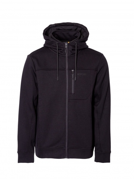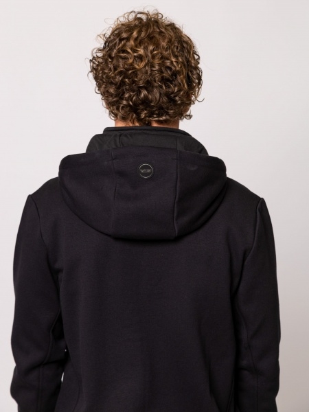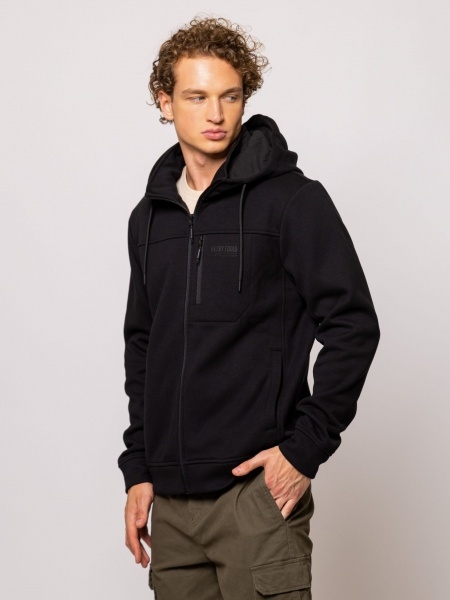 Férfi cipzáros, kapucnis pulóver, sportos kialakítással, három cipzáros zsebbel, állítható kapucnival, kis márkajelzéssel az elején és a kapucnin. Anyaga: 60% pamut, 40% poliészter, belül bolyhozott fleece