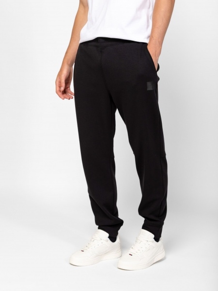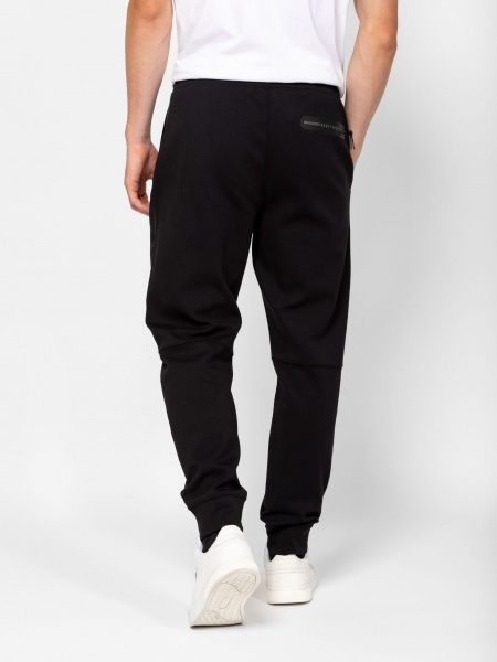 Férfi melegítőnadrág, kényelmes szabással, passzéban végződő szárral, húzózsinórral állítható, elasztikus derékkal, oldal zsebekkel, hátsó cipzáros zsebbel, jól szellőző anyagból, kis márkajelzéssel az elején. Anyaga: 76% pamut, 19% poliészter, 5% elasztán.