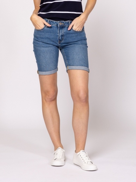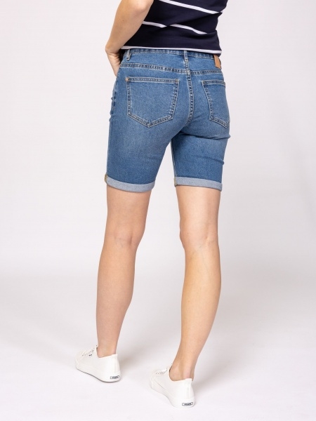 Női farmer rövid nadrág, klasszikus kidolgzással, comb középig érő hosszal, 5 zsebbel, cipzáros záródással, övtartókkal, slim fit szabással, alap színekben, kis márkajelzéssel az érmezseben, elasztánnal kevert pamut anyagból. Anyaga: 91% pamut, 7% poliészter, 2% elasztán, farmer.
