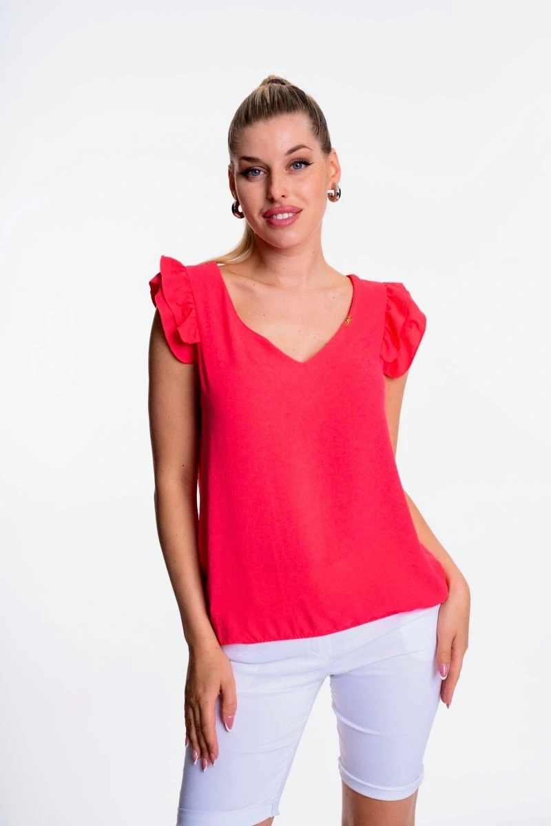 Enyhén elasztikus krepp anyagból készült, fodros vállú blúz, gumírozott aljarésszel, kis fém márkajelzéssel.